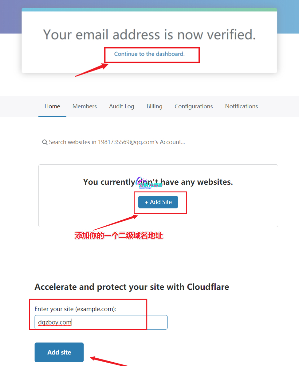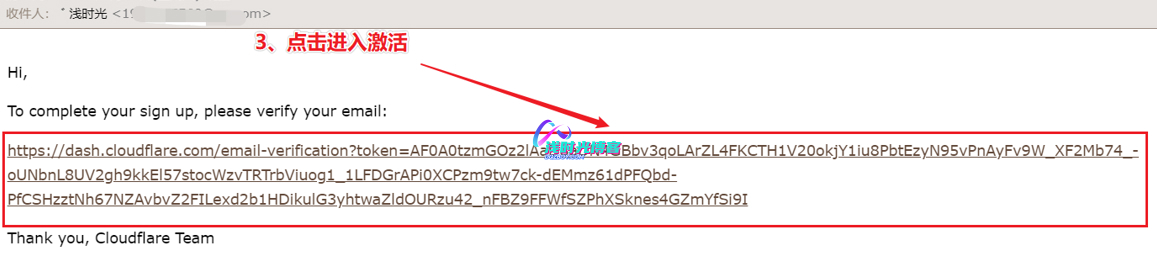 - 此时Cloudflare会发送一份激活账号的邮件到你注册的邮箱中,然后登入邮箱并进入邮件中提供的地址进行激活账号