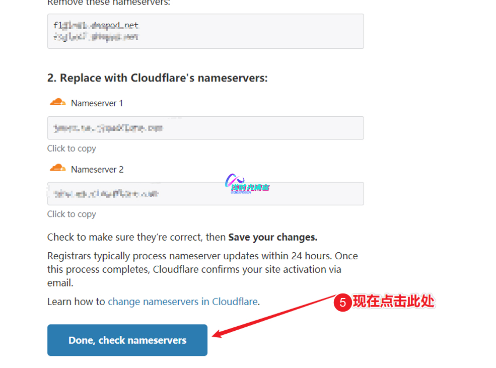 - 继续下一步,到这里会提示让你修改Nameservers(域名服务器),并提供了两个域名服务器地址,先去你的注册域名的网站修改域名的域名服务器,下面我就以 腾讯云 为例来说明如何修改域名服务器