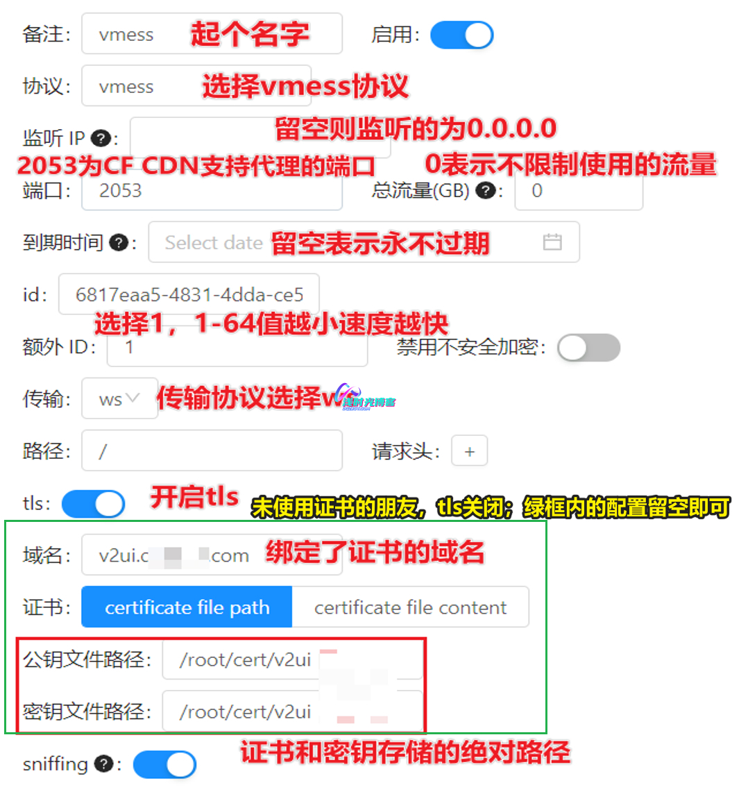 注意:在下图中,如果未使用域名和证书的朋友,tls关闭、域名和证书文件的配置留空即可!