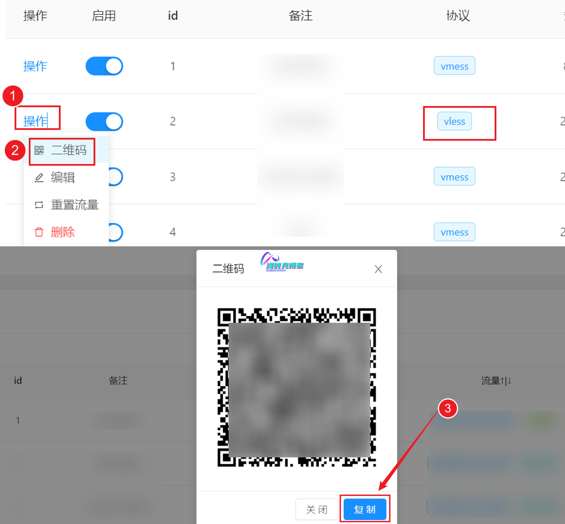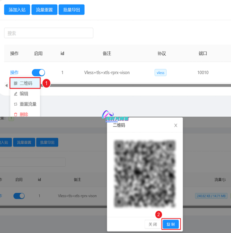 - 点击二维码,然后弹出二维码框之后,手机可以直接使用V2RayNG或者IOS版小火箭客户端扫描添加节点信息;点击二维码下面的复制,拷贝节点信息