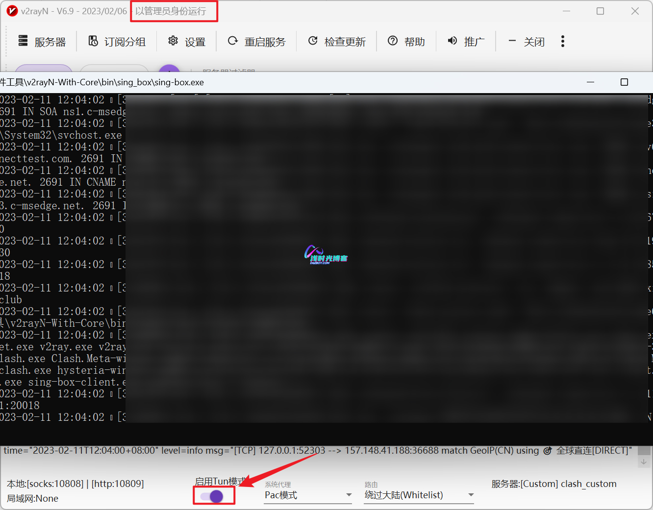 正因为有了tun才能让科学上网达到近乎完美的状态。目前v2rayN6.0以上的版本支持了tun模式,其实就是调用singbox的内核。对于不习惯用clash的用户来讲是一个好消息,软件界面也做了很大的改变。 开启tun模式 需要以管理员权限运行。默认情况下会弹出命令行窗口,如果觉得这个黑框很碍事,可以在tun设置中将显示控制台关闭,保存后再来尝试开启就不会再有那个黑框了。