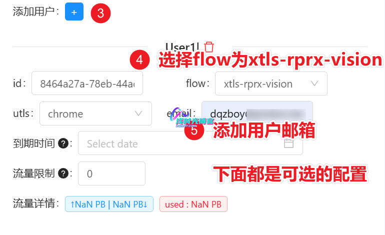 UUID/PassWord与email,添加用户时会自动生成默认值,可以自行修改;Email用于在日志/流量统计中区分单独的用户,请确保每个用户的Email值是唯一的
