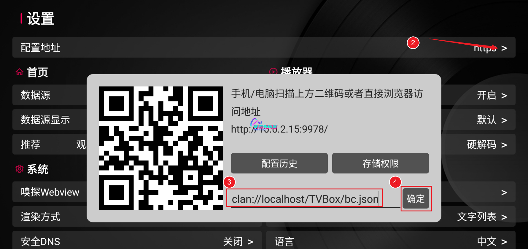 - 获取本地配置地址:点击tvbox本地配置地址