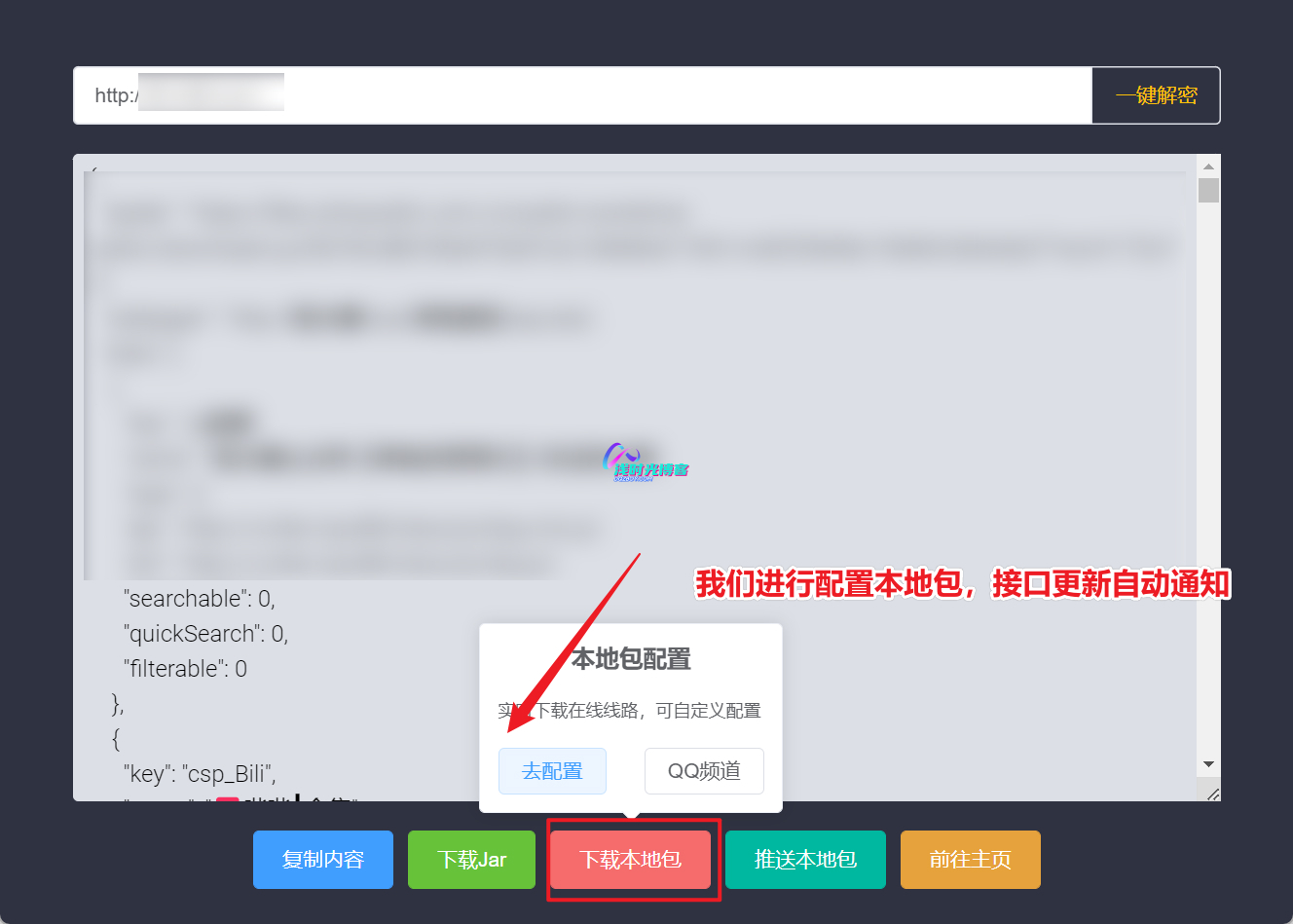 - 配置好之后,我们点击下载本地包,将下载下来的本地包通过U盘或者其他的介质传到我们的TV上,然后配置TVBox读取本地包即可使用了!