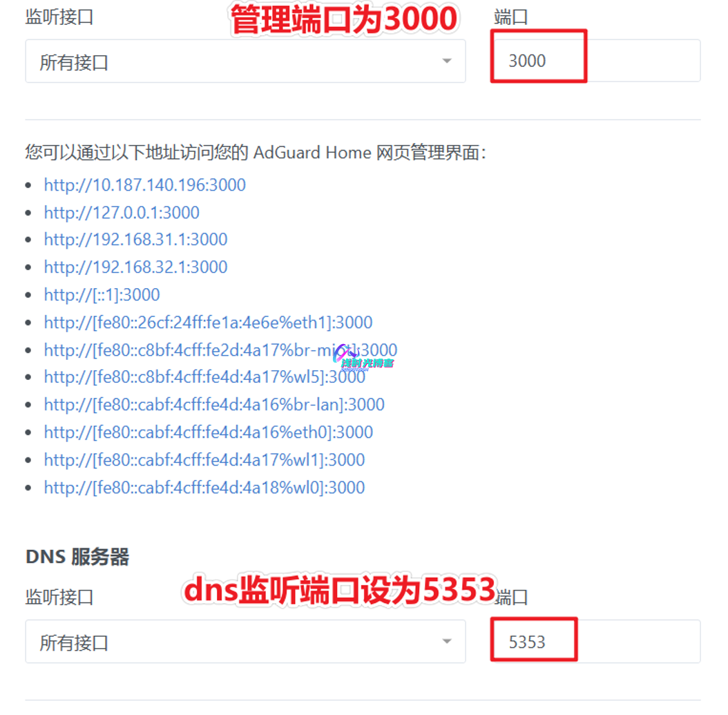 注:5353端口为 AdGuardHome 的 DNS 服务器监听端口(重要)