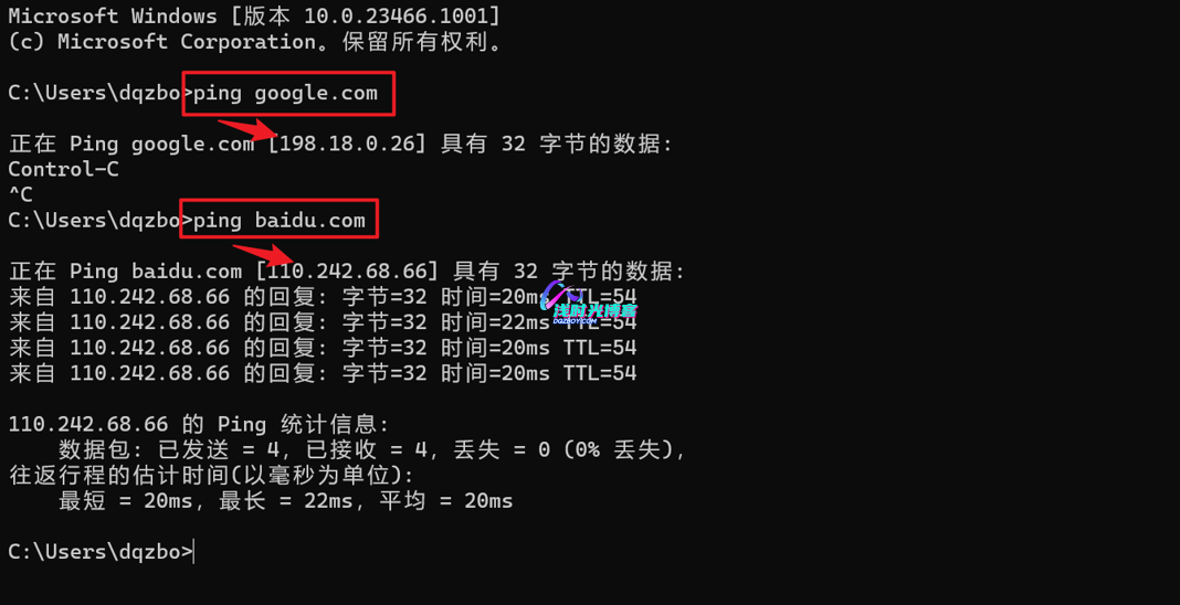 通过本机PING国内外域名,查看效果;预期为:国内直连真实IP,国外fake-ip,192.168.x.x