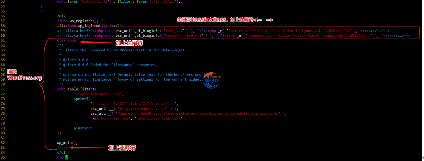 去除文章RSS和评论RSS和wordpress.org,添加注释