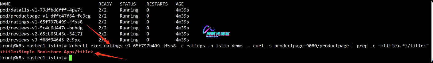 [root@k8s-master1 istio]# kubectl exec ratings-v1-65f797b499-jfss8 -c ratings -n istio-demo -- curl -s productpage:9080/productpage | grep -o "<title>.*</title>"