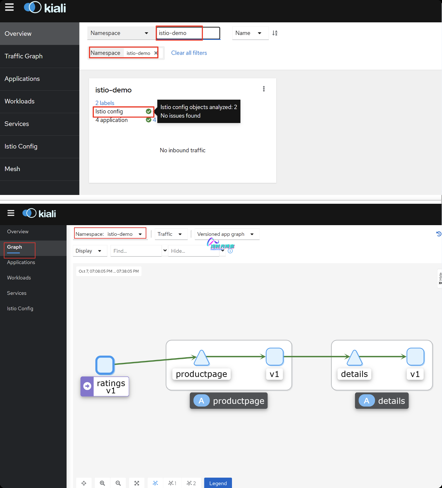 istio-demo。 - Kiali仪表板显示了网格的概述以及