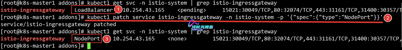[root@k8s-master1 ~]# kubectl patch service istio-ingressgateway -n istio-system -p '{"spec":{"type":"NodePort"}}'