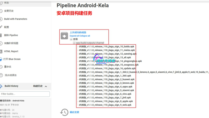 - 多渠道包会在构建完毕后自动进行归档,用户可在Jenkins的Job页面获