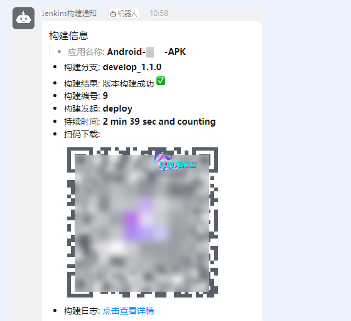 - 构建完成后,制品将被上传至蒲公英平台,并自动调用API接口以获取二维码,方便后续分享。